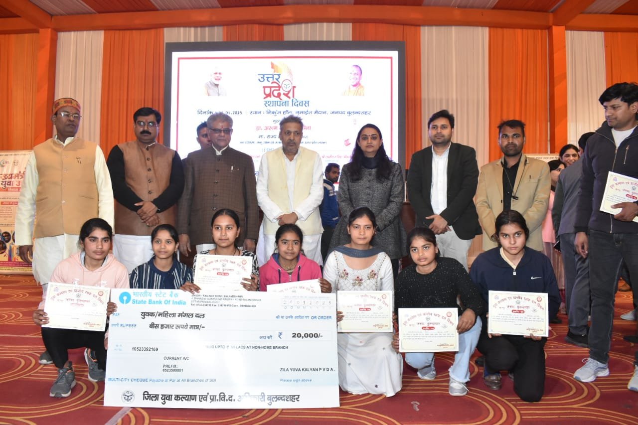 बुलंदशहर – पेंटिंग प्रतियोगिता में स्कूली बच्चों ने दिखाई अपनी प्रतिभा, प्रभारी मंत्री सहित अन्य हुए प्रफुल्लित। प्रभारी मंत्री द्वारा पेंटिंग व सांस्कृतिक कार्यक्रम की मनमोहक प्रस्तुति देने वाले बच्चों को किया प्रोत्साहित एवं पुरस्कृत बच्चों ने दी सांस्कृतिक कार्यक्रमों की प्रस्तुतियां प्रभारी मंत्री द्वारा विभिन्न विभागों से शासकीय कार्यों में उत्कृष्ट कार्य करने वाले कर्मचारियों व अधिकारियों को किया गया सम्मानित नुमाइश मैदान के (निकुंज हॉल) में राज्य मंत्री (स्वतंत्र प्रभार), वन, पर्यावरण, जन्तु उद्यान एवं जलवायु परिवर्तन विभाग उत्तर प्रदेश सरकार डॉ अरुण कुमार की गरिमामई उपस्थिति में उत्तर प्रदेश का स्थापना दिवस मनाया गया। कार्यक्रम का शुभारंभ प्रभारी मंत्री व जिलाधिकारी श्रुति एवं विधायकगण द्वारा दीप प्रज्ज्वलित कर किया गया। इस अवसर पर उत्तर प्रदेश की संस्कृति एवं दिव्य तथा भव्य महाकुंभ पर पेंटिंग्स का प्रदर्शन किया गया, स्वयं सहायता समूह एवं विभिन्न विभागों द्वारा स्टालों को लगाया गया, जिसका अवलोकन मंत्री जी द्वारा किया गया। साथ ही स्कूली बच्चों द्वारा सांस्कृतिक कार्यक्रम की मनमोहक प्रस्तुति दी गई। उपस्थित जनसमूह द्वारा लखनऊ में उपराष्ट्रपति भारत सरकार एवं मुख्यमंत्री उत्तर प्रदेश सरकार की उपस्थिति में आयोजित कार्यक्रम का सजीव प्रसारण भी देखा गया। लखनऊ कार्यक्रम में जनपद के मैसर्स सनसाईन वेजिटेबिल्स प्रा0लि0 सिकन्दराबाद कर्नल सुभाष देशवाल को गाजर उत्पादन एवं कृष्णा पीकल्स बुलन्दशहर कृष्णा यादव को आचार उत्पादन हेतु सम्मानित किया गया। कार्यक्रम में उपस्थित जनसमूह को मंत्री ने सम्बोधित करते हुए कहा कि उत्तर प्रदेश एक गौरवशाली प्रदेश है। शास्त्रों के अनुसार हिंदुस्तान की 07 प्राचीन नगरियों में से 03 उत्तर प्रदेश के अंदर है जहां सभ्यता का विकास हुआ है। उत्तर प्रदेश ने सबसे अधिक प्रधानमंत्री इस देश को दिए है। आज उत्तर प्रदेश में देश एवं दुनिया के लोग इन्वेस्ट करने के इच्छुक है। आज प्रदेश तरक्की के मार्ग पर अग्रसर है। हम सबको मिलकर सरकारी योजनाओं को आगे बढ़ाना है। देश की एक तिहाई आबादी महाकुंभ में स्नान करने जा रही है। हम सब सौभाग्यशाली है कि हमारा जन्म भगवान राम और कृष्ण की भूमि पर हुआ है। उत्तर प्रदेश देश में जनसंख्या के अनुसार तो प्रथम है ही इसके साथ विश्व में कई देशों से भी बड़ा है। आज उत्तर प्रदेश अपनी सनातन एवं धार्मिक परंपराओं के साथ ही कानूनी प्रतिबद्धताओं को साबित कर रहा है। उन्होने कहा कि मुख्यमंत्री के कुशल नेतृत्व में उत्तर प्रदेश विकास के पथ पर आगे बढने के साथ अपनी परम्पराओं से भी देश एवं दुनिया को परिचित करा रहा है। मुख
