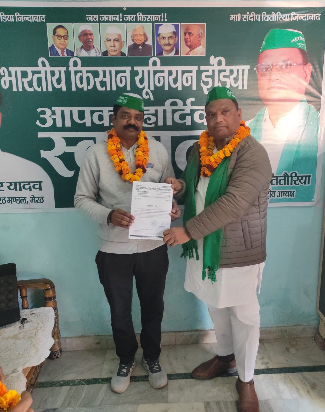 मेरठ। – भारतीय किसान यूनियन इंडिया के राष्ट्रीय अध्यक्ष संदीप तितौरिया ने मेरठ सॉउथ ब्रह्मपुरी निवासी कुलदीप कुमार गुप्ता को भारतीय किसान यूनियन इंडिया का राष्ट्रीय कोषाध्यक्ष नियुक्त किया गया। इस मौके पर सभी कार्यकर्ताओं व पदाधिकारियों ने हर्ष प्रकट किया। राष्ट्रीय कोषाध्यक्ष नियुक्त किये जाने पर नवनियुक्त कोषाध्यक्ष ने भी राष्ट्रीय अध्यक्ष को धन्यवाद देने के साथ ही यूनियन को आगे बढ़ाने का पूर्ण विश्वास दिलाया गया। बधाई देने वालों में राष्ट्रीय उपाध्यक्ष देव नागर, राष्ट्रीय माहसचिव धर्मेंद्र गुर्जर, जितेंद्र गुर्जर, राष्ट्रीय सचिव सरदार अमनदीप सिंह, जिलाध्यक्ष अंकुर चपराणा, मण्डलाध्यक्ष ओमकार यादव, मनीष खारी, पंकज राणा, अरुण लखवाया, हर्ष बंसल, डॉ संजीव अग्रवाल, प्रदीप गोयल, पुनीत बंसल, दीपांशु तितौरिया, राष्ट्रीय अध्यक्ष महिला मोर्चा शिल्पी पटेल, प्रदेश अध्यक्ष प्रिया राय, वसीम राहुल, कासिफ मंसूरी, रईस अल्वी, उमर कुरैशी, शाहिद अल्वी, विपुल सिंह, ललित मुंडे, मनोज सुभाष बडगूजर आदि मुख्य रुप से शामिल रहे।