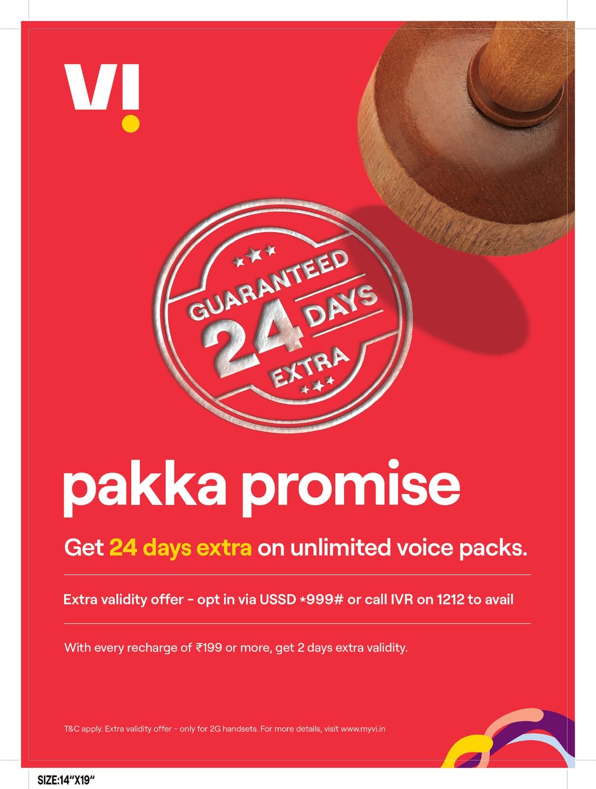 इस प्रोग्राम के तहत रु 199 और अधिक का अनलिमिटेड वॉइस पैक रीचार्ज कराने पर उपभोक्ता 12 महीने के भीतर 24 दिनों की अतिरिक्त वैलिडिटी का लाभ उठा सकेंगे, हर बार रीचार्ज करने पर उन्हें 2 दिनों की अतिरिक्त वैलिडिटी मिलेगी। वी गारंटी प्रोग्राम का उद्देश्य वॉइस-ओनली या लो डेटा यूसेज़ उपभोक्ताओं की मुश्किलों को हल करना है, जिन्हें एक ही महीने के भीतर दोबारा रीचार्ज करना पड़ता है। आमतौर 28 दिनों के पैक के साथ उपभोक्ता को एक ही महीने में दो बार रीचार्ज करना पड़ता है या कभी-कभी उनकी सर्विस में रुकावट आ जाती है।